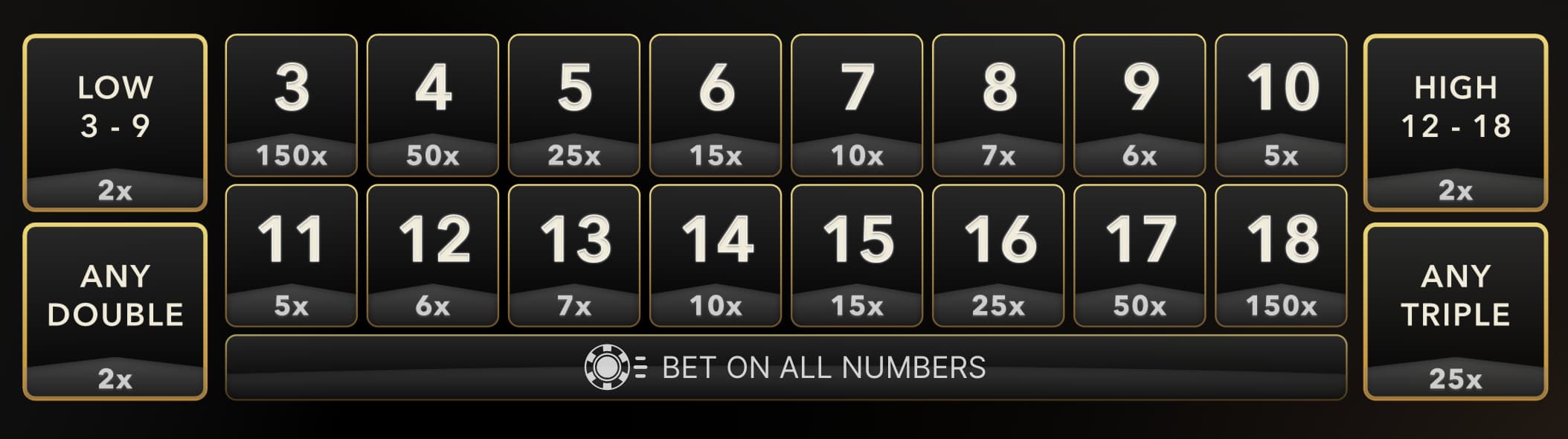 As possíveis combinações vencedoras variam de 3 a 18, e você pode apostar em cada uma. Você pode até cobrir todas as oportunidades de apostas disponíveis, mas não aconselhamos fazer isso, pois é terrível a longo prazo. Sem multiplicadores ativos, os pagamentos das várias combinações são os seguintes: