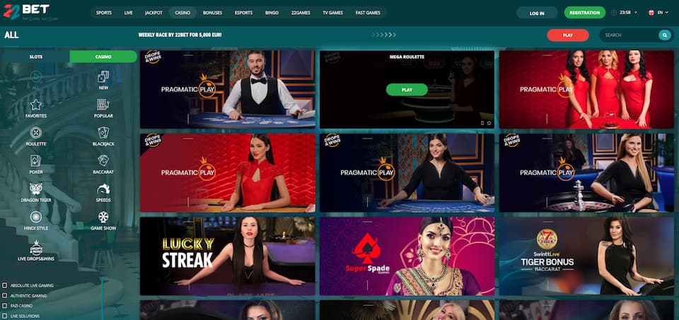 O 22Bet Casino hospeda alguns dos desenvolvedores de jogos mais reconhecidos, apresentando várias empresas que oferecem Jogos ao vivo de cassino. 22bet é um dos poucos, se não o único, que promove mais do que a evolução clássiPT e o jogo pragmático em shows e jogos de mesa com um revendedor ao vivo. Como você verá mais adiante na seção abaixo, eles têm um dos catálogos de slot mais extensos que você já viu.