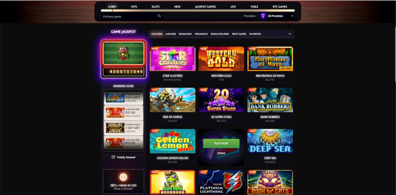 Por outro lado, os jogadores de criptografia estão sempre procurando BTC Games Fair Fair, tais como o Dados mais populares de jogo de criptografia, outros procuram Hilo, Batida, e Plinko, E não vamos esquecer os slots de criptografia. Infelizmente, este cassino on -line que aceita criptomoedas, eles não têm esses jogos. Eles ainda o surpreenderão com a seleção de jogos deles.