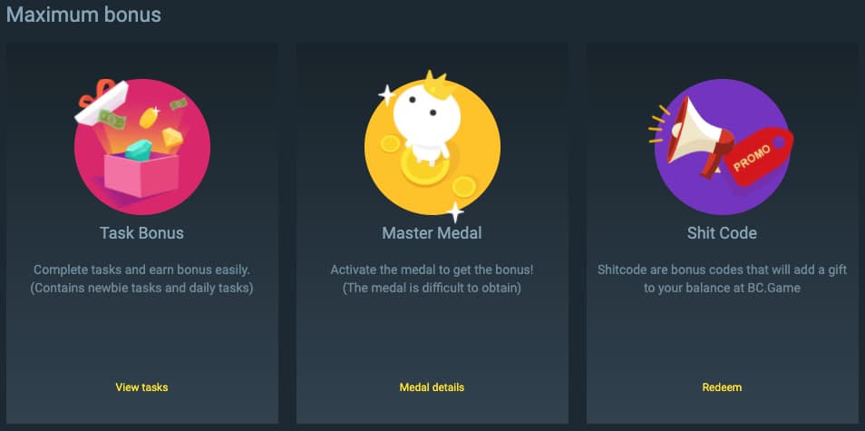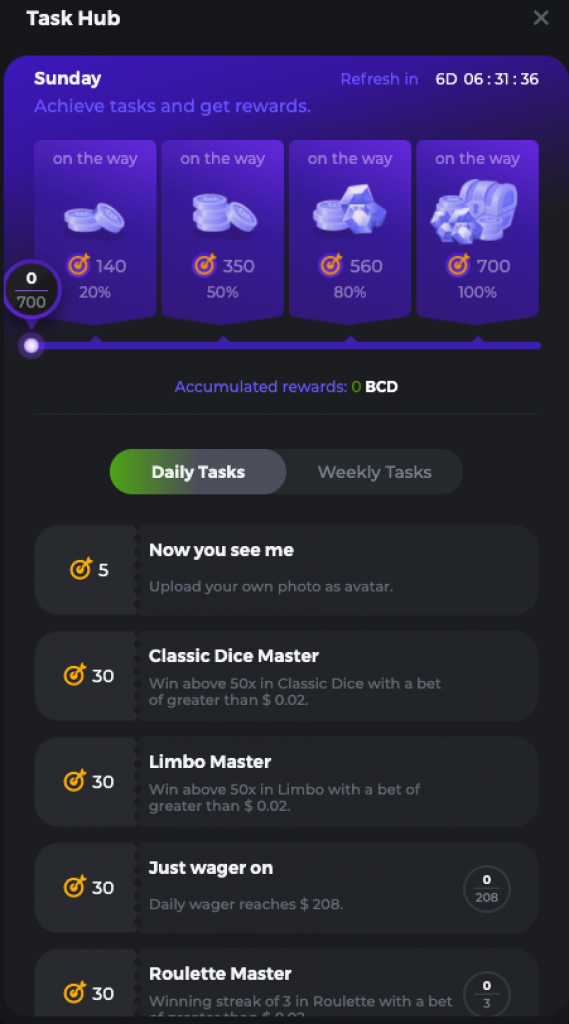 Como afirma o título, você tem tarefas a serem concluídas, você encontra todas elas na seção, para Ganhe criptomoedas gratuitas. Parte do bônus vem simplesmente verificando seu endereço de e -mail, fazendo sua primeira aposta e escrevendo algo no canal aberto ... e assim por diante. As tarefas são realmente fáceis de concluir e, depois de terminar todas, você já tem um bom equilíbrio para começar a jogar o jogo que mais sentir naquele momento.