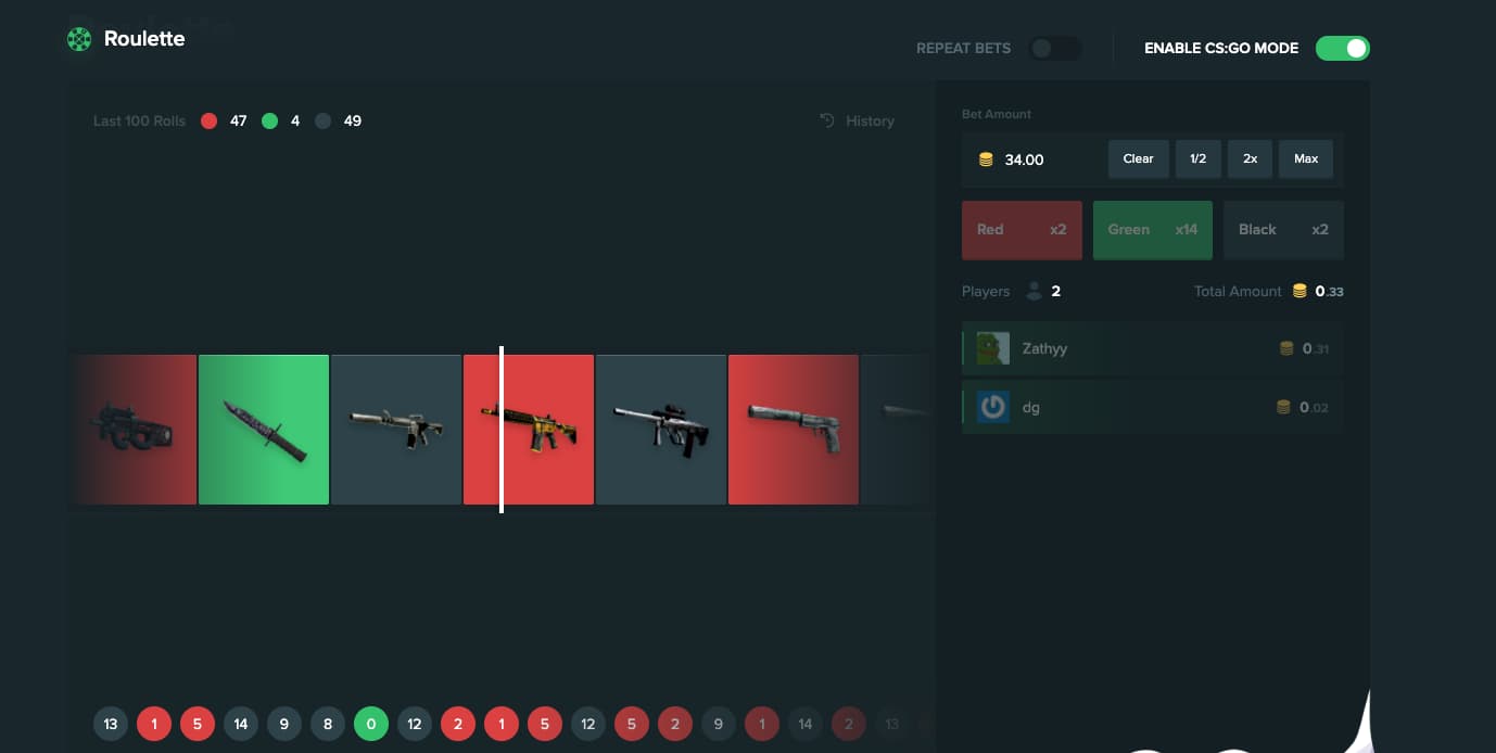 Os fãs do CSGO adorarão vir e jogar aqui, alguns recursos interessantes permitem que o jogador mude a interface e as operações do jogo. Assim que você pousar no site, você começará a perceber imediatamente que eles oferecem: Cassinos vivos (incluindo blackjack, Monopólio ao vivo, e Roleta de iluminação), Slots de bitcoin, Duelo Dadas e Bitcoin Roleta. O bom recurso que eles têm é na roleta, como você pode ver abaixo, você pode ativar o modo CS: GO e ativar o design exclusivo para ele - verifique nosso Guia sobre estratégias de dados de bitcoin que se aplicam à roleta também.