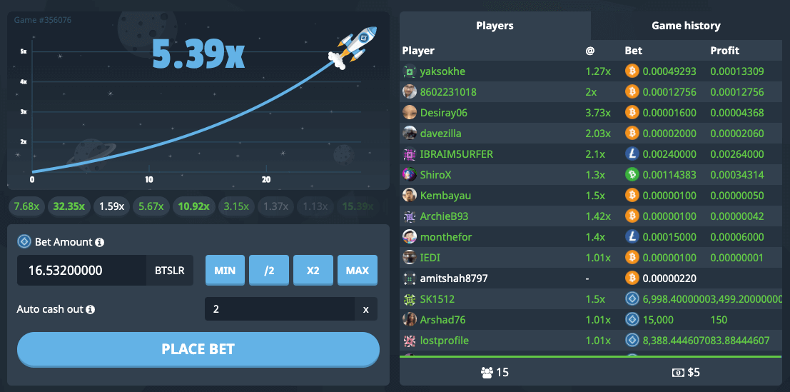 Como você pode ver na foto (abaixo), há um multiplicador e, à medida que sobe, fiPT cada vez maior. Mas tenha cuidado porque, como o ônibus espacial pode ter problemas e explodir, o mesmo pode acontecer se você não retirar sua aposta!