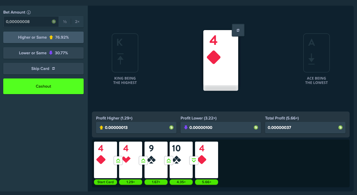 O jogo Bitcoin Hilo é um jogo divertido e direto; Isso lhe dará emoção e tensão simultaneamente devido à estrutura do jogo. Na página de jogo HILO Provamente justa, você verá todas as estratégias e probabilidades que você tem ao jogar e os ganhos em potencial que você pode ter.