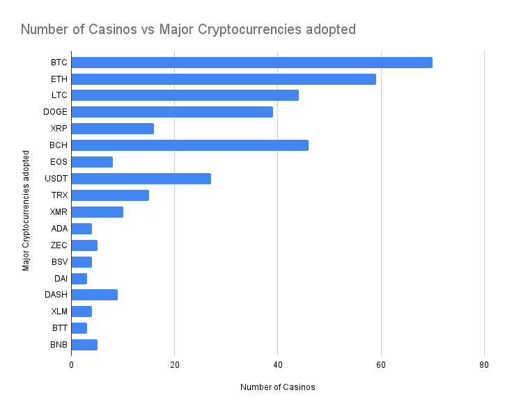 Aqui está uma representação do número de cassinos de criptografia que adotaram cada moeda como sua moeda (dados com base em nosso banco de dados atual de Revisões de cassino criptográfico).