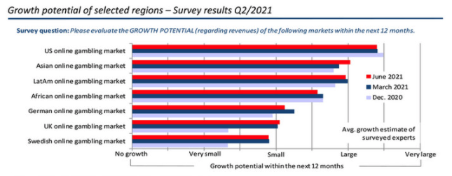 De acordo com o relatório “Global Online Gambling Market (2020-2025) por jogos, dispositivo, geografia, análise competitiva e o impacto do CoVID-19 com a ANSOFF Analysis”, o mercado de jogos de azar online é estimado em atingir US € 97,69 bilhões até 2025, crescendo a uma taxa de crescimento anual composta (CAGR) de 11,31%.