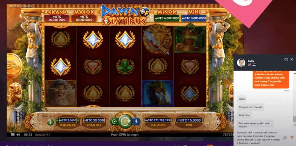 Como afirma o título deste artigo, um incrível, provavelmente A maior vitória na história do jogo um jogador jogando em bitcasino.io Ganhou 171 BTC graças ao amanhecer do Olympus Slot. Fazendo um magnífico 5700x da primeira aposta (30000MBTC) - veja a foto abaixo!