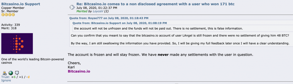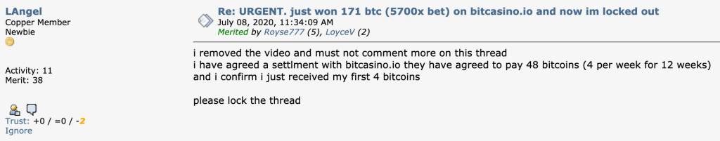 Outra O tópico foi aberto por Yahoo62278, um dos mais respeitados BitCointalker do fórum, que queria ter mais esclarecimentos do cassino e entender exatamente por que Langel se estabeleceu com apenas 48 BTC em vez de 171 BTC. Além disso, conforme declarado no tópico, o vídeo inicial publicado por Langel foi removido e isso ficou muito suspeito.