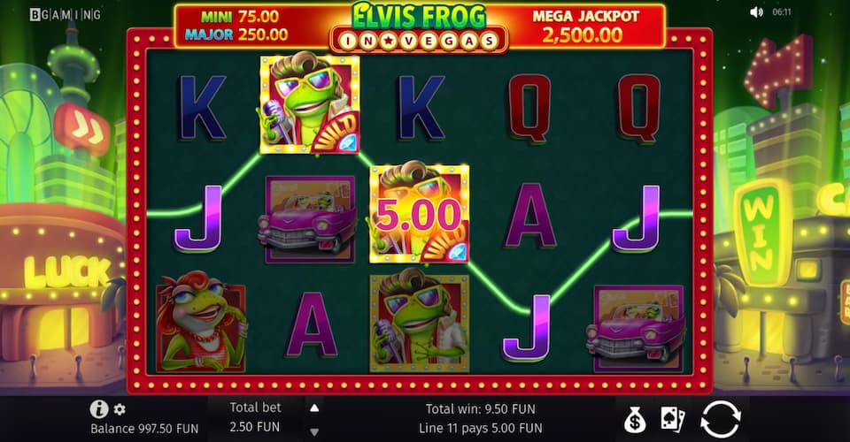 Elvis Frog na Paytable de Las Vegas consiste em um cartão de J a J Royals, oferecendo 5x a participação por conseguir uma combinação vencedora de cinco de um tipo. Em seguida, na fila são símbolos de sapo de microfone, guitarra, carro e fêmeas, pagando 20x a 50x a estaPT por pousar cinco símbolos correspondentes. O personagem principal do Elvis Frog é o símbolo selvagem do jogo, que também oferece 50x o valor da aposta para alinhar cinco idênticos em uma linha de pagamento. Se tudo for o seu caminho, você também pode ganhar o slot Prêmio máximo de 2500x a participação.